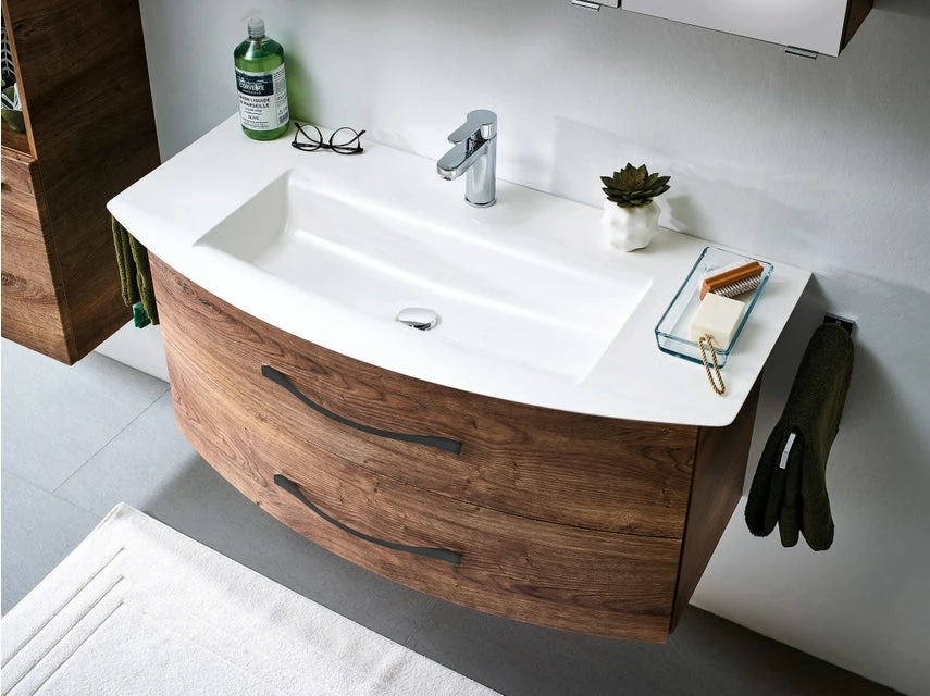Gestalten Sie Ihr Badezimmer mit unserem Modell Mondo Spa in Eiche Ribbeck Nachbildung besonders wohnlich und einladend. Das hochwertig verarbeitete Set besteht aus einem Spiegelschrank inklusive LED-Beleuchtung, einem Minerlgussbecken und einem Waschtisch-Unterschrank. Ein integrierter Kosmetikeinsatz sorgt für Ordnung und Übersicht im Unterschrank.