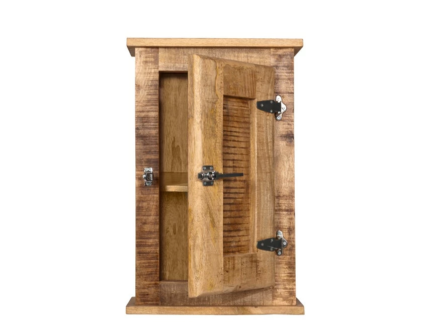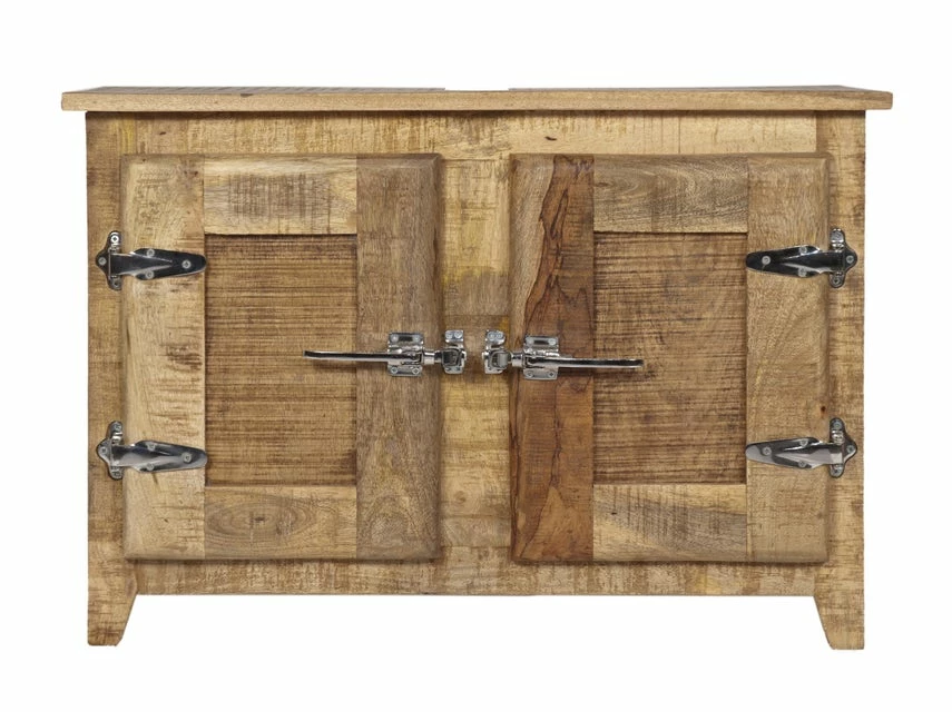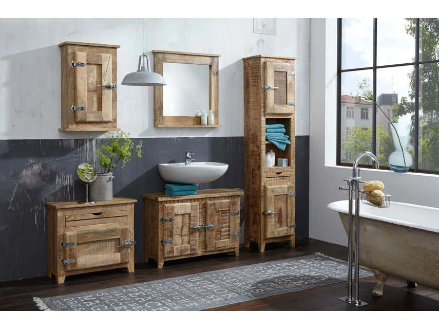 Holen Sie sich mit diesem Bad-Set das gewisse Etwas in Ihr Badezimmer. Ein Hochschrank, eine kleine Kommode, ein Hängeschrank und der Waschbecken-Unterschrank bieten genug Platz fßr Handtßcher, Putzmittel und Co, dazu noch ein Spiegel mit Ablage. Die natßrliche Maserung und Struktur des Mangholzes ist sichtbar und verleiht den BadmÜbeln eine schicke Note. Der charakteristische goldene Farbton des Holzes verleiht dem Raum Wärme und harmoniert optimal mit den meisten Farben. Besonderes Highlight sind die silberfarbenen Kßhlschrankgriffe, welche als Tßr Hebel dienen. Fßr ein ansprechendes Ambiente im Badezimmer eine gute Wahl.