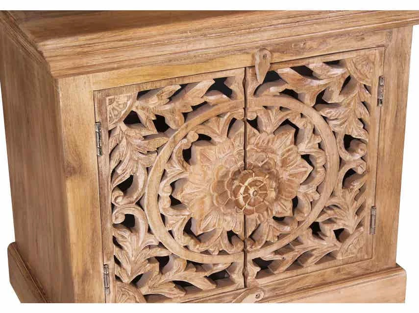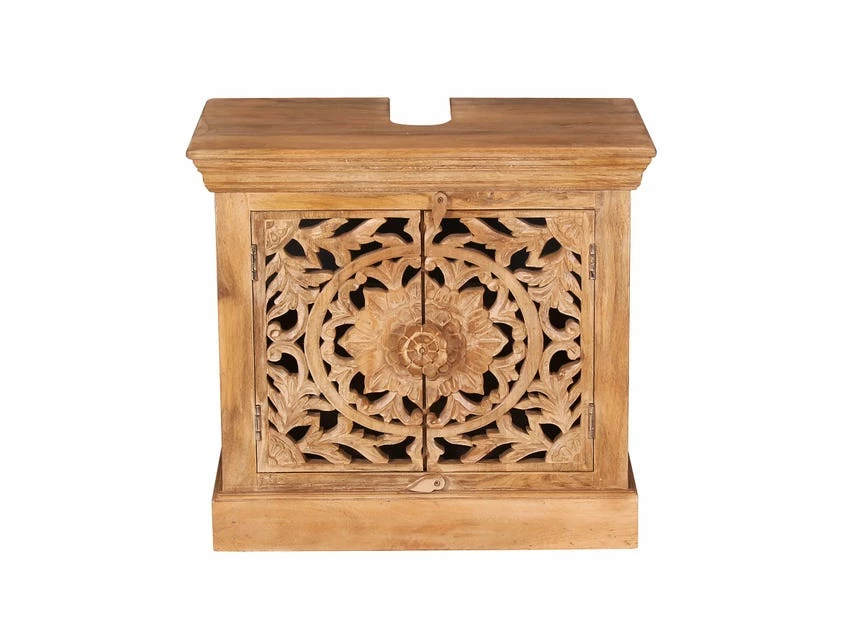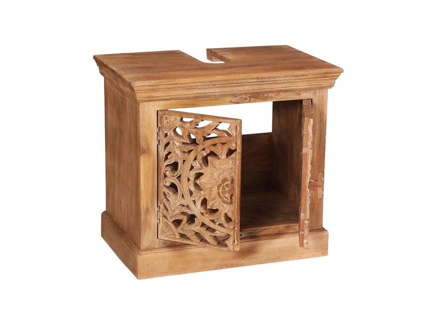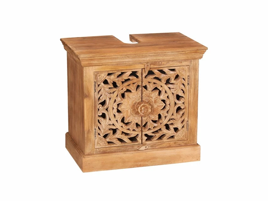 Holen Sie sich einen Hauch von Exotik in Ihr Badezimmer. Dieser Unterschrank überzeugt mit Charakter und Einzigartigkeit. Angefertigt aus Mangoholz in einem warmen Naturton und mit aufwändigen Schnitzereien verziert, lädt der Stil zum Träumen ein. Die Deckplatte wurde mit der nötigen Aussparung für den Abfluss des Waschbeckens versehen. Im Inneren des Beckenschranks findet sich hinter den 2 Türen genügend Stauraum für Badreiniger, Putzutensilien, WC-Reiniger usw.