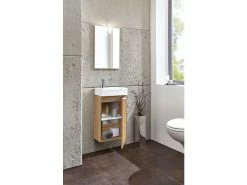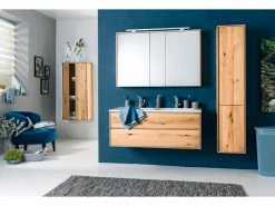 Der Spiegelschrank Lina mit einem Korpus in lackierter Wildeiche wird sich auch in Ihr Badezimmer harmonisch einfügen. Hinter den drei Türen mit Spiegel verbergen sich vier Glaseinlegeböden, welche reichlich Platz für Kosmetik- und Pflegeprodukte bieten. Für optimale Beleuchtung garantiert eine integrierte LED-Aufsatzleuchte.