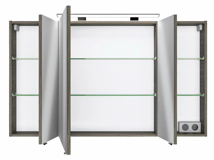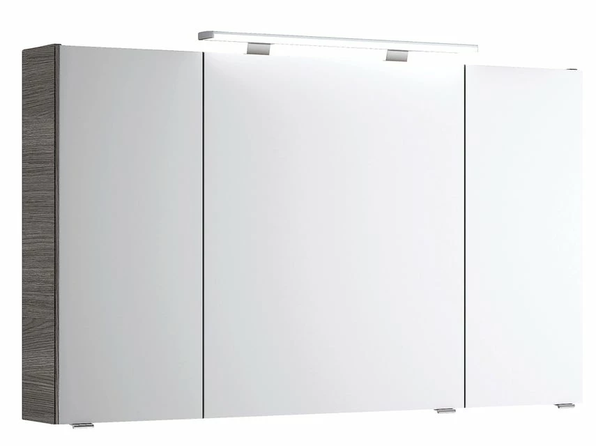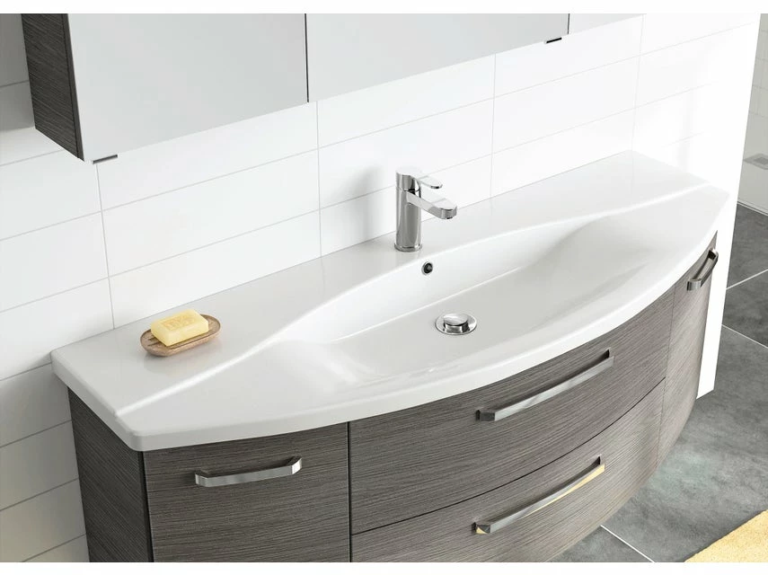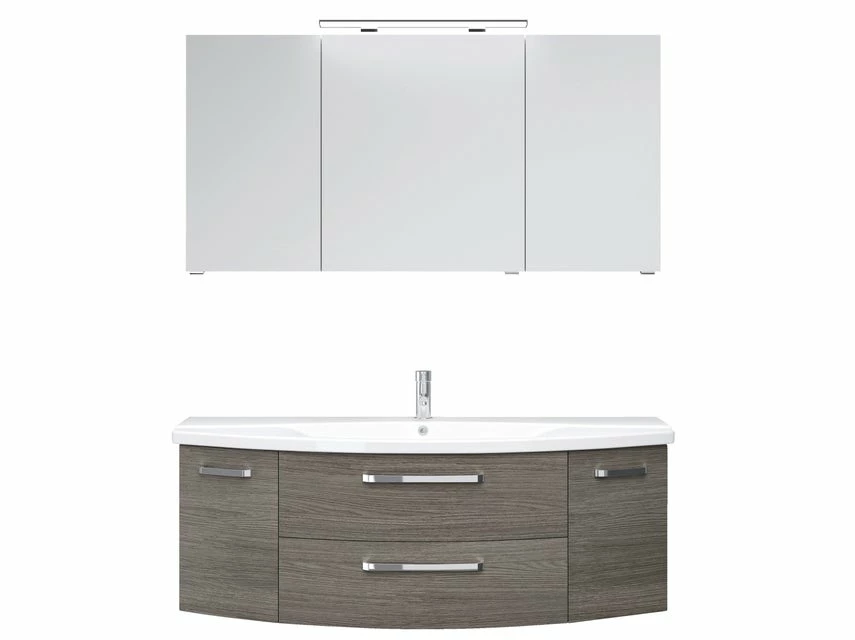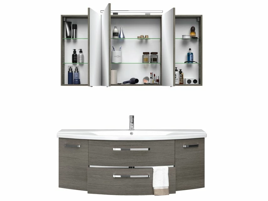 Mit dem Badezimmerblock Valea in modernem Graphit gestalten Sie Ihr Badezimmer modern und genießen herrlich viel Stauraum. Der Spiegelschrank mit drei Türen verbirgt insgesamt sechs Einlegeböden aus Glas, perfekt geeignet für alle Ihre Pflegeprodukte. Ein zusätzliches Highlight ist die integrierte Aufsatzleuchte. Im geräumigen Unterschrank können hinter zwei Türen und in den beiden Schubladen Ihre Badtextilien oder Reinigungsmittel sicher aufbewahrt werden. Perfekt abgerundet wird dieses moderne Badezimmer-Set mit einem hochwertigen Keramik-Waschbecken. Sie werden begeistert sein!