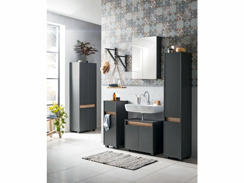 Mit dem Hochschrank Cosmo holen Sie sich ein schlichtes Badmöbel mit herrlich viel Stauraum in Ihre persönliche Wellnessoase. Das grifflose Modell besticht durch sein modernes Design in zeitlosem Anthrazit.