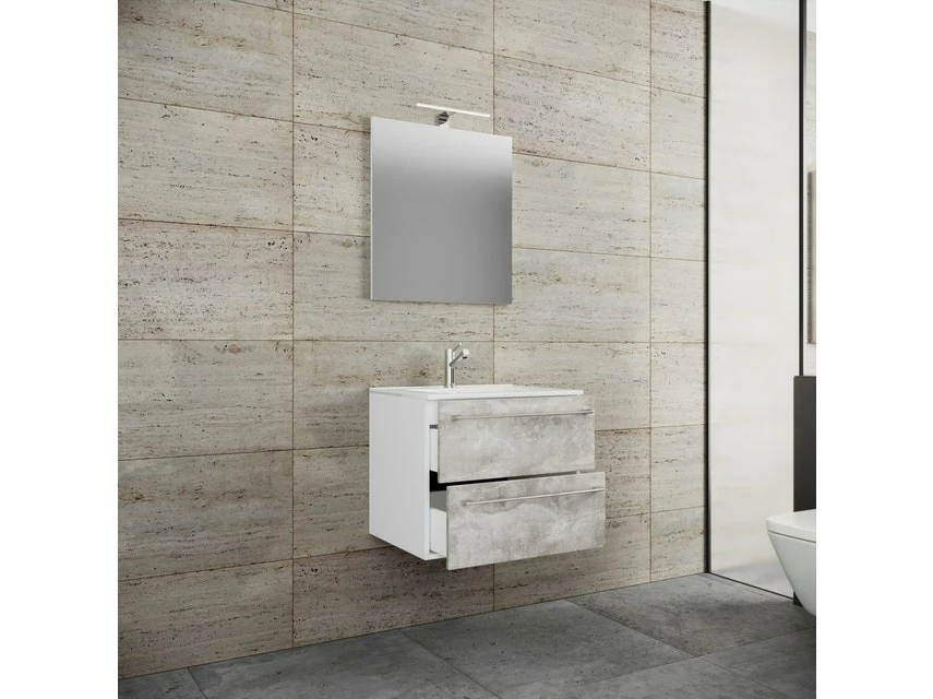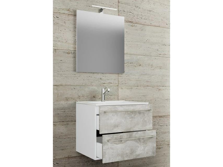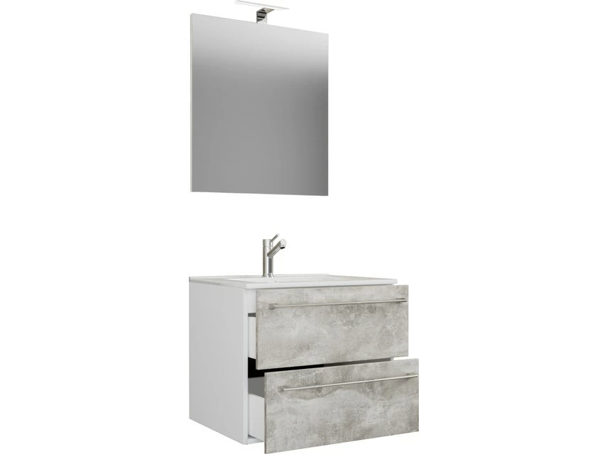 Das Badmöbel-Set Badinos besteht aus einem Unterschrank mit zwei Schubladen auf robusten Meteallschienen. Ein modernes Waschbecken aus massivem Keramik und ein Spiegel aus ESG-Sicherheitsglas runden das Möbel ab, um den perfekten Bickfang im Badezimmer zu erhalten.