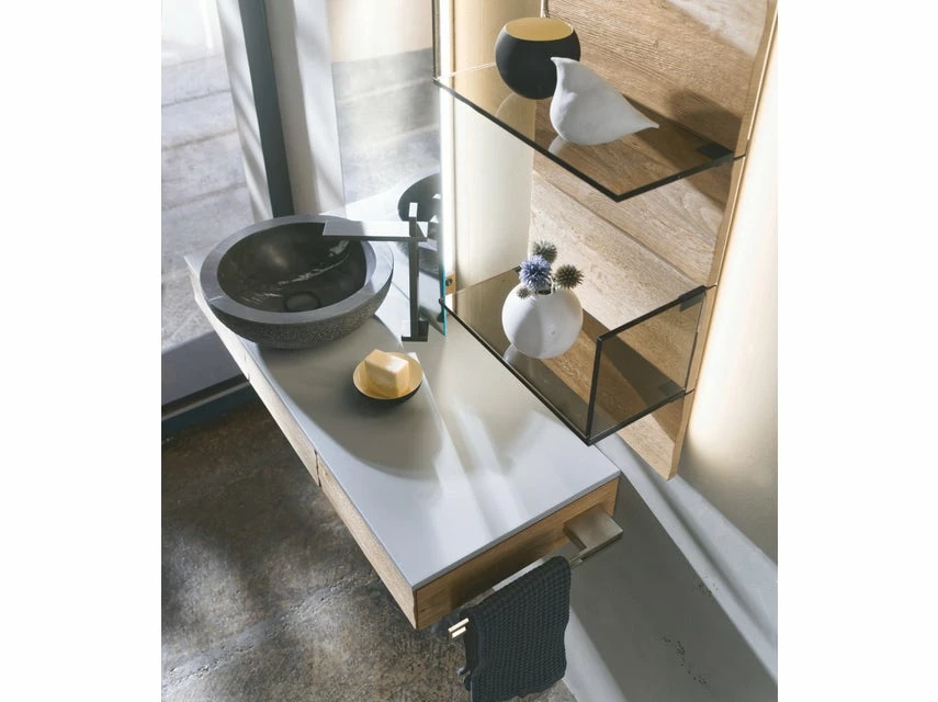 Das Badezimmerprogram Vmontanara ist hochwertig in Voglauer Marken-Qualität verarbeitet und hat alles zu bieten, was Sie für Ihr modernes Badezimmer benötigen. Seine massive Front und der furnierte Korpus in lackierter Wildeiche sorgen für eine warme, wohnliche Atmosphäre und das Waschbecken aus Acrylstein setzt dazu einen starken Kontrast. Wellness für Ihr Zuhause ist mit diesem Set garantiert!